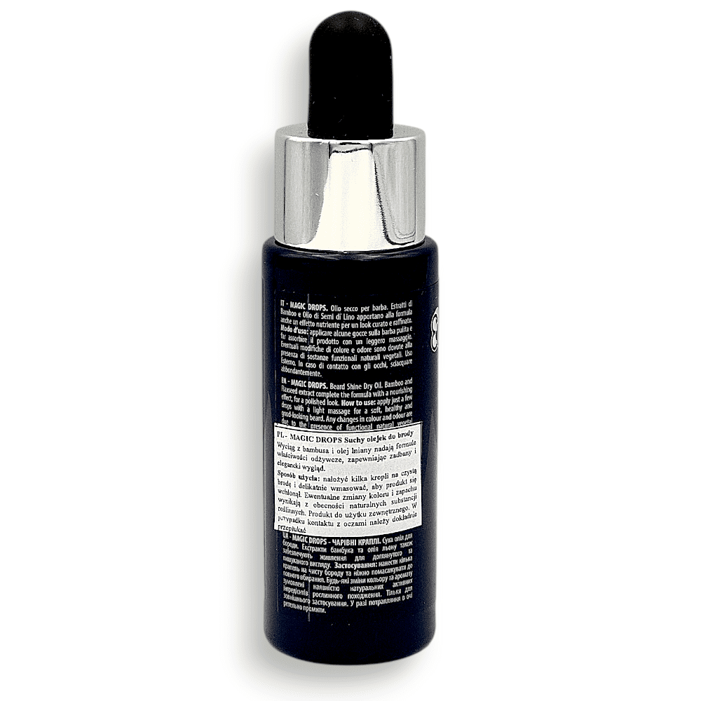 Magic Drops to lekki, nawilżający olejek stworzony z myślą o pielęgnacji brody i skóry twarzy. Dzięki połączeniu naturalnych składników – oliwy z oliwek, oleju lnianego i rycynowego – skutecznie odżywia włosy, nadając im zdrowy blask i miękkość bez uczucia tłustości. Zawarty ekstrakt z miazgi bambusa działa kojąco, łagodzi podrażnienia oraz wspiera regenerację skóry. Regularne stosowanie pomaga utrzymać brodę w doskonałej kondycji, a Tobie – cieszyć się zadbanym, estetycznym wyglądem.